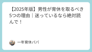 トップページ 2025.10.07 サイトのコンセプト 当サイトは、男性の育児休業取得が当たり前になる社会を目指し、育休の準備から復帰後まで、 パパたちが抱えるあらゆる悩みや疑問に寄り添う情報を提供します。 サイト運営者 一年育休パパ 一年育休パパです。娘の為に1年間育休を取得し、その時の様子を発信しています。 カテゴリー別記事 テーマ別に整理された記事をご覧ください これから育休を取得するパパへ 男性育休の給付金を徹底解説!実際の月々の手取り額も公開! 【実体験】妊娠から育休開始まで!男性育休取得の完全準備ガイド 【体験談】男性育休は1年取るべき?3ヶ月との決定的な違いを解説 【2025年版】男性が育休を取るべき5つの理由|迷っているなら絶対読んで! 現在、育休中のパパへ 【育休パパ必見】育児が楽になる!絶対入れるべき必須アプリ4選 育休からの復帰を考えているパパへ